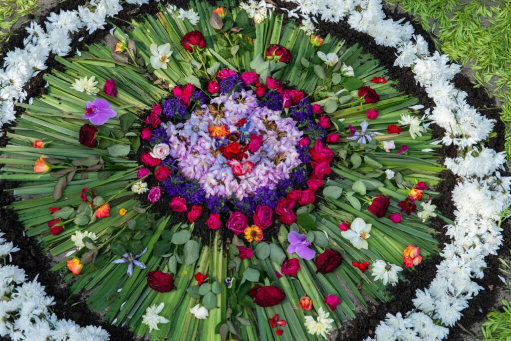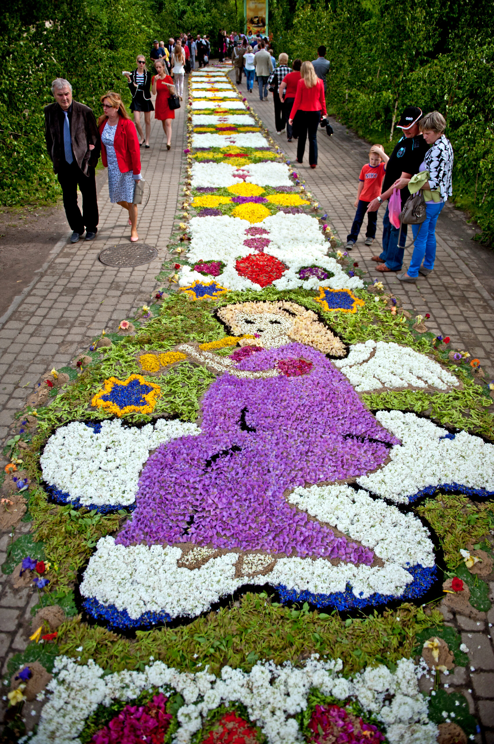Mieszkańcy zbierają kwiaty tuż przed świętem i przechowują je w chłodnych miejscach. Układanie dywanów rozpoczyna się rano, każda rodzina działa we własnym rytmie. Aby podziwiać dywany, najlepiej przyjechać około południa. Większość wzorów jest już wtedy gotowa lub w trakcie powstawania.